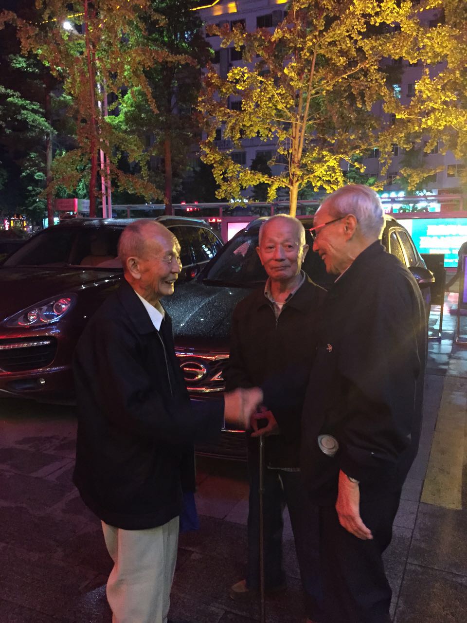 10月30日晚,丁方荛和甘跃廷二老先行到达酒店。二人一见面,手就牢牢攥在一起,很久都没有分开。老人相互聊着家常:“你牙齿掉了没有”“还可以”。之后,周乾元老人(家住遂宁本地)也赶来酒店一同共进晚餐。周老健谈,且记忆力超群,谈起当年的往事滔滔不绝,每一个细节都记得很清晰。丁老和甘老在旁边就频频点头,说对对,就是这样,还说当年我们在一起就是他最能说。