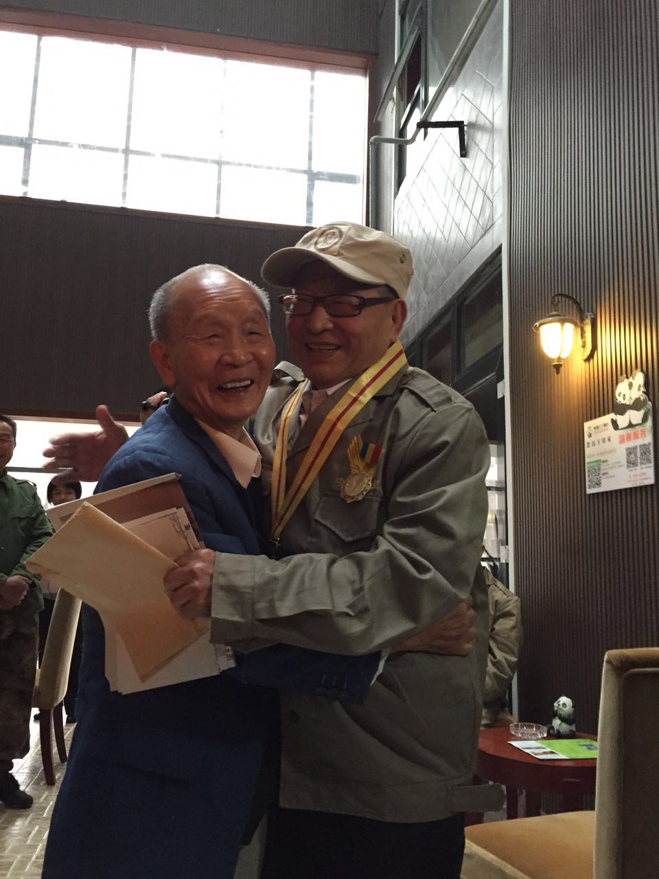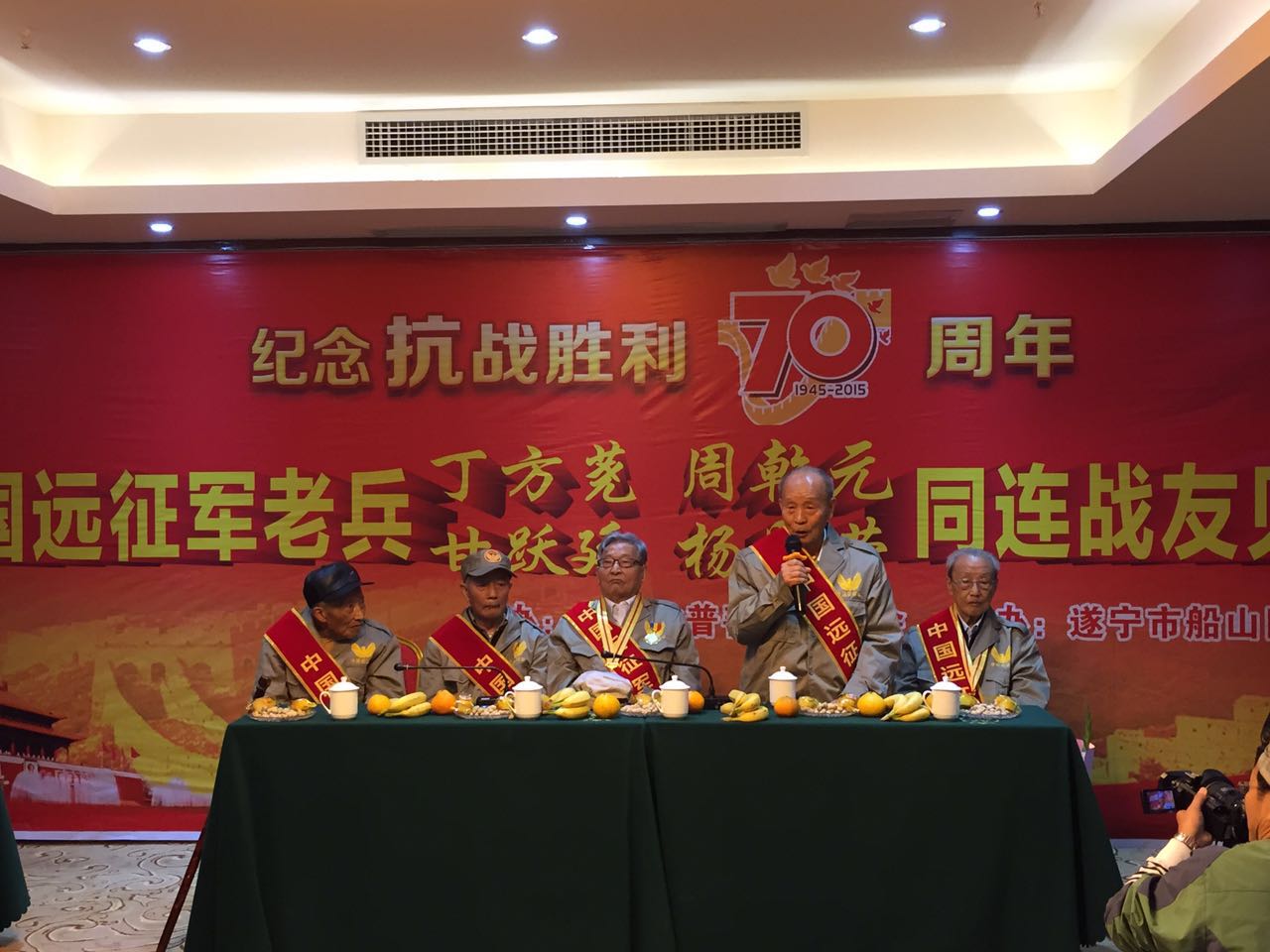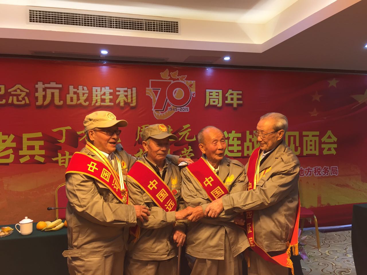 在抗战胜利经历了70年的岁月洗礼,他们有着不一样的人生,但内心却有着在有生之年再见老战友的共同心愿。2015年10月31日,在四川省普善公益协会的组织,以及遂宁市船山区地税局的资助下,五名远征军抗日老兵丁方荛、周乾元、甘跃廷、杨恩荣、危孝伦(除危孝伦外其余四人是同连战友)在四川遂宁熊猫王子酒店会面。